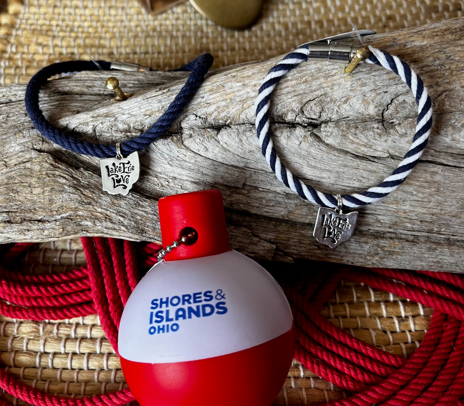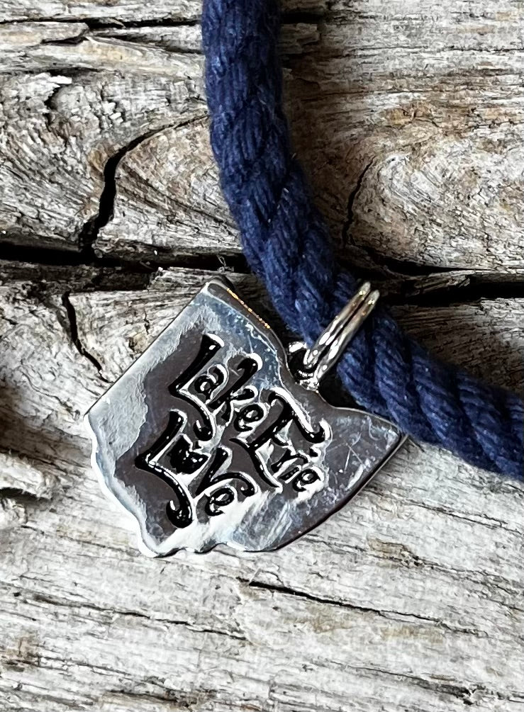 Show your Lake Erie Love!!  We collaborated with Shores and Islands Ohio to bring you this cute single strand stackable cuff.  Made with 100%  Cotton Cord, it holds an exclusive State of Ohio shaped charm with the "Lake Erie Love" message.   A locking, magnetic clasp secures this bracelet, making it an easy on/off accessory.  The charm measures 1.5 cm wide by 1.25 cm long.  Available in Navy Blue or our Navy and White Twist.