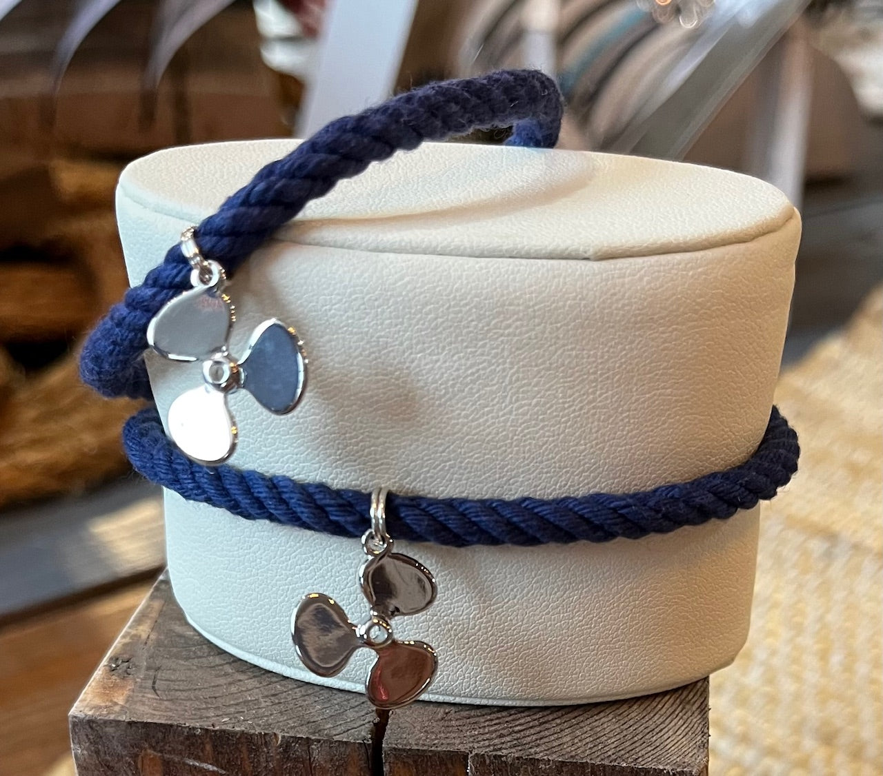 You'll be making waves when you add our exclusive Prop Bracelet to your Nautical collection. A 3 -bladed prop hangs from a strand of our 100% cotton, Navy Blue Cord. Finished with our magnetic, locking clasp, this mariner's cuff will stand out in a crowd.